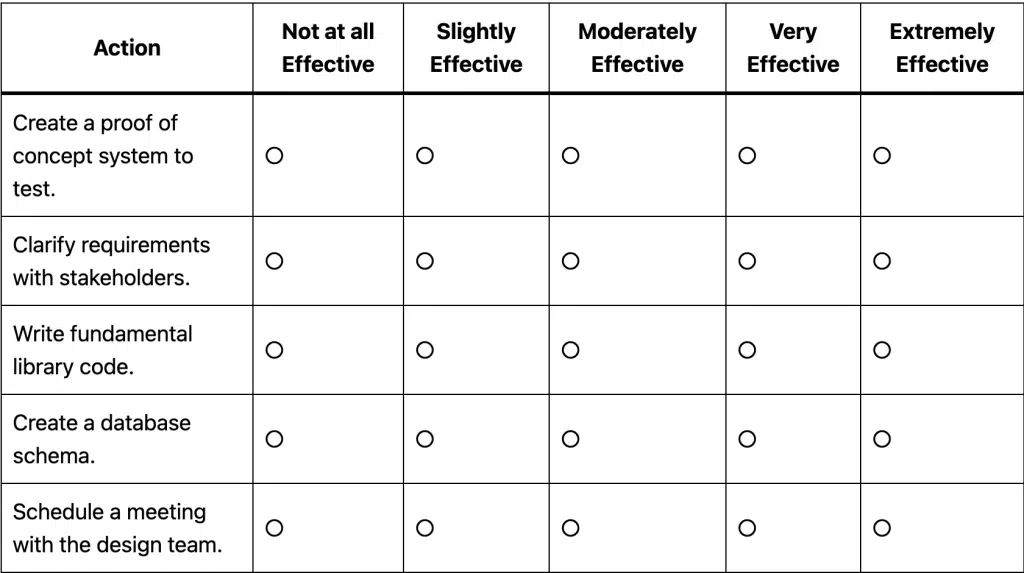 Rate the effectiveness of each action below as if it were your next step.